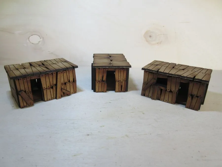 A set of 3 Orc shacks at 15mm scale. The buildings are each approximately 65mm long, 45mm wide and 33mm high. Each roof is designed to be easily removable as long as it has not been glued on. A variety of extra planks are included that can be glued on the outsides to add extra variety.