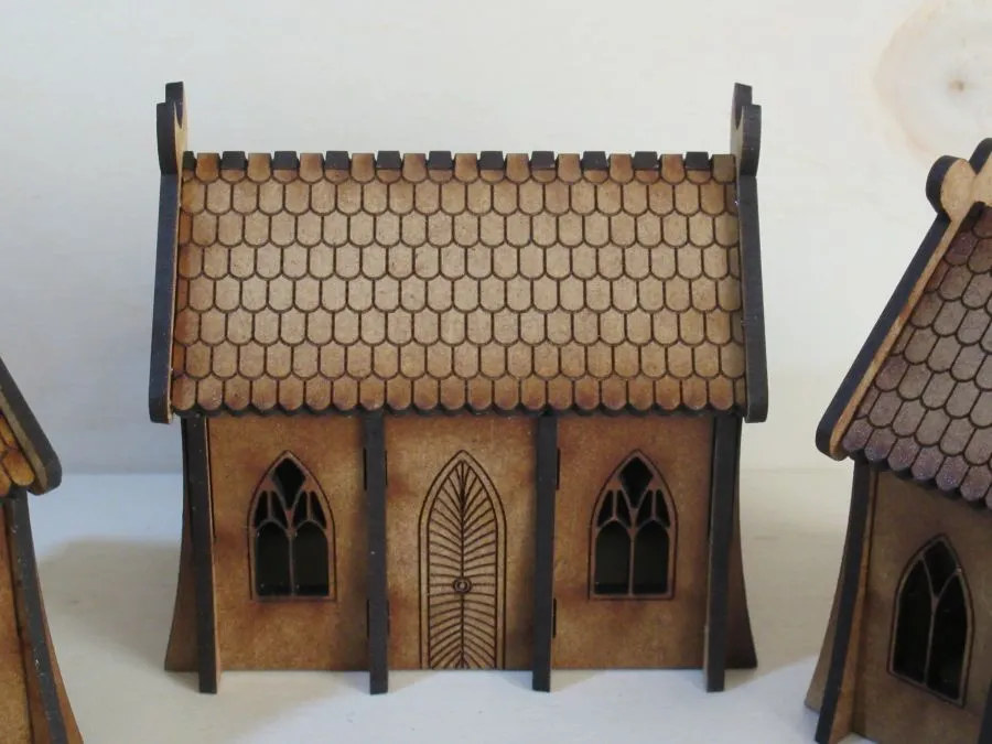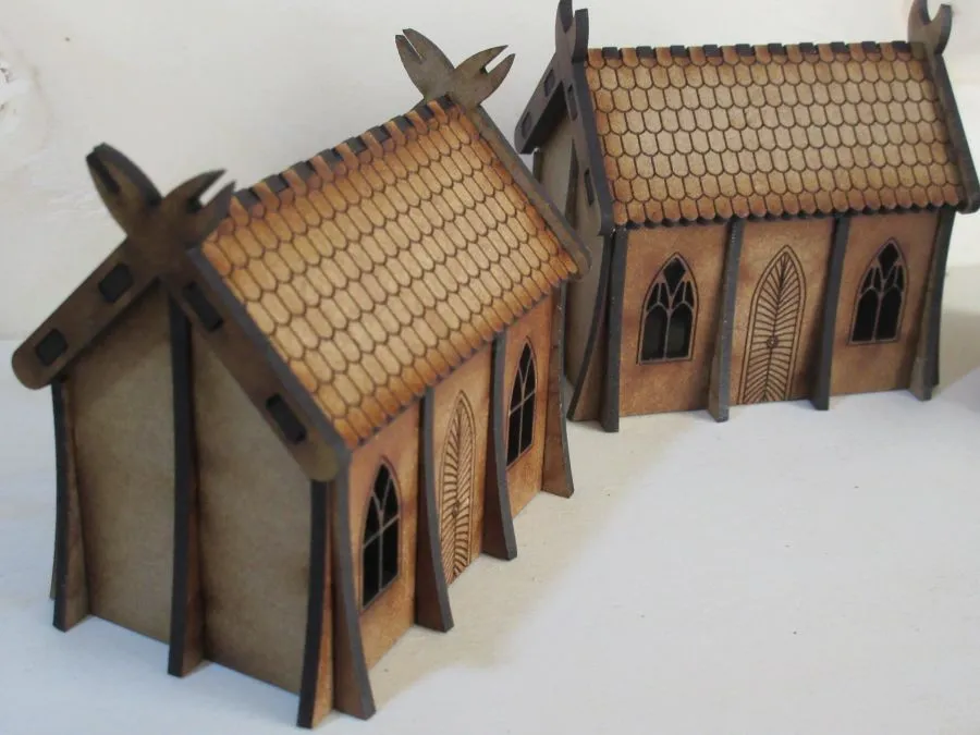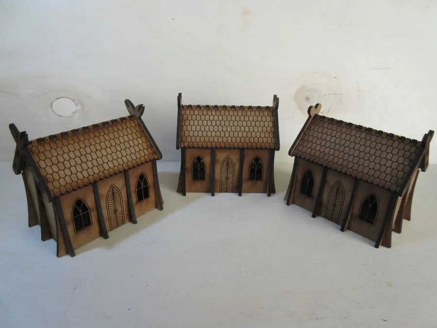 A set of 3 simple Elven dwellings at 15mm scale. The buildings are each approximately 72mm long, 50mm wide and about 65mm high. Each roof is designed to be easily removable as long as it has not been glued on.
