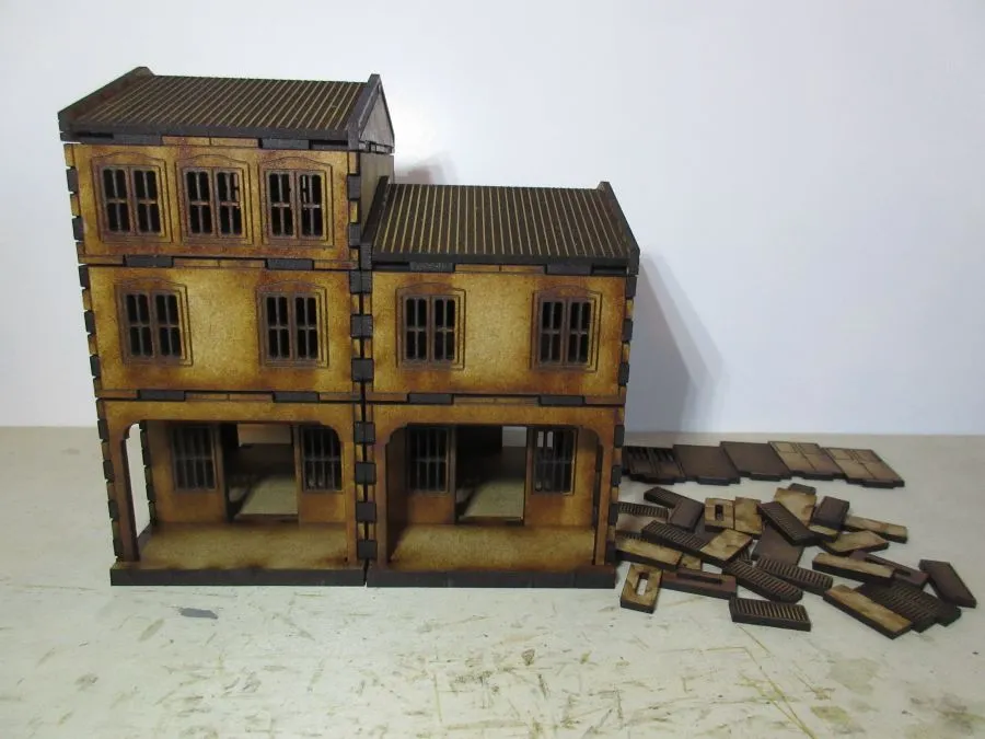 This is a multi-pack of our 20mm Asian Shop Houses containing the variant 1, variant 2 and variant 3 sets all at 20mm scale. Each of the three variant sets consists of 2 ground floors (4.5cm high), 2 2nd floors (3cm high), 1 3rd floor (2.5cm high) and 2 roofs (2cm high). There are also separate doors with stands and numerous shutters that can be glued on where needed. The foot print of each building is 6cm x 8.6cm. Once glued together each floor slots easily onto the other floors enabling different heights of buildings to be made as required as well as enabling miniatures to be easily placed inside the buildings during use.