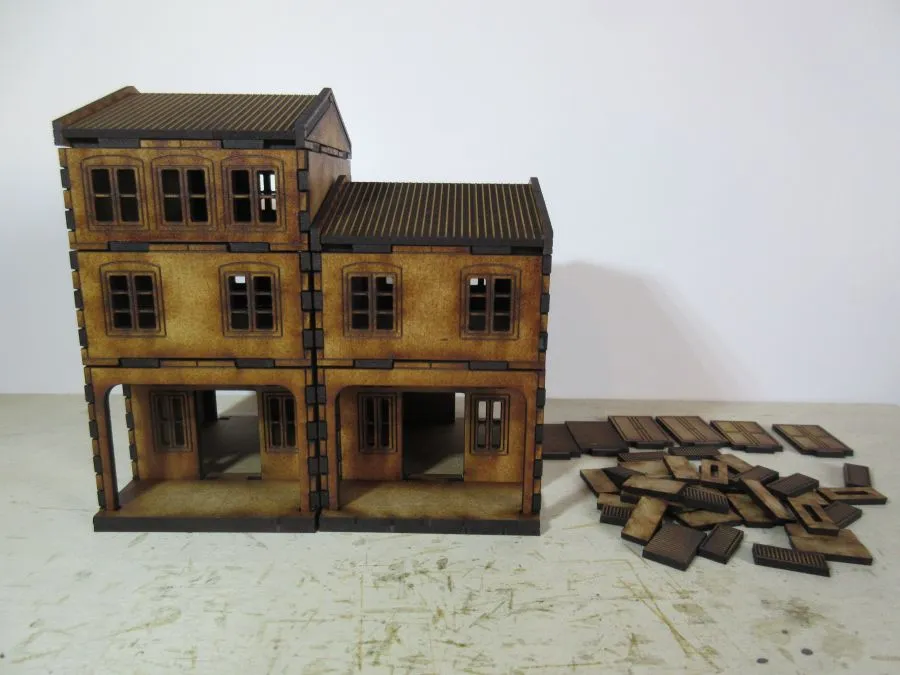 A set of 2 Asian Shop Houses at 20mm scale. The set consists of 2 ground floors (4.5cm high), 2 2nd floors (3cm high), 1 3rd floor (2.5cm high) and 2 roofs (2cm high). There are also 6 separate doors with stands and numerous shutters that can be glued on where needed. The foot print of each building is 6cm x 8.6cm. Once glued together each floor slots easily onto the other floors enabling different heights of buildings to be made as required as well as enabling miniatures to be easily placed inside the buildings during use.