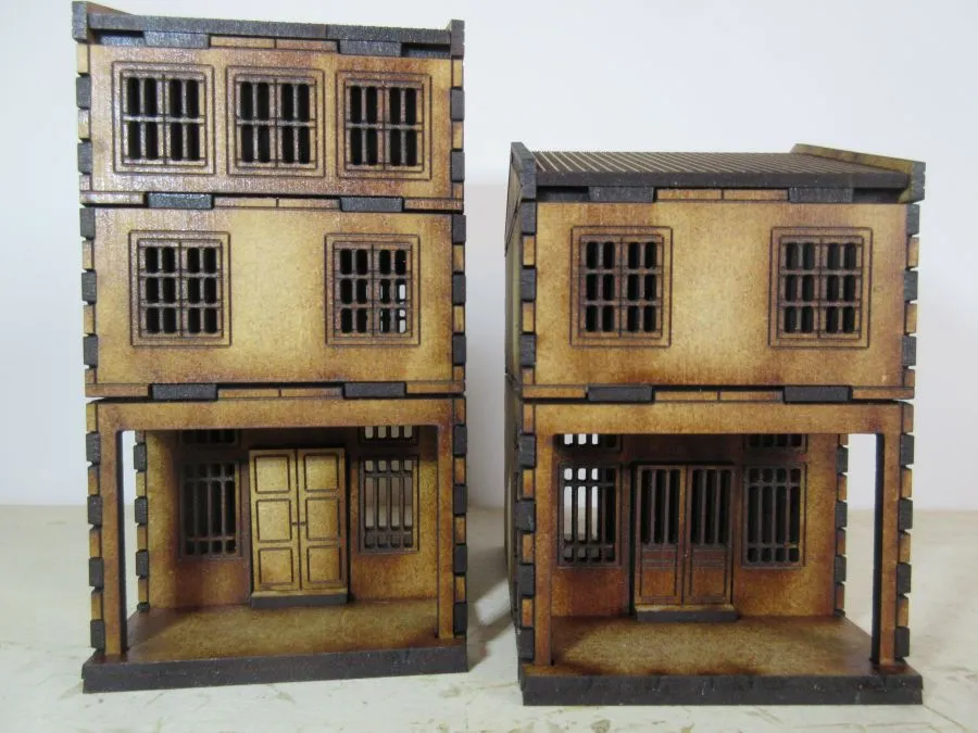 A set of 2 Asian Shop Houses at 20mm scale. The set consists of 2 ground floors (4.5cm high), 2 2nd floors (3cm high), 1 3rd floor (2.5cm high) and 2 roofs (2cm high). There are also 6 separate doors with stands and numerous shutters that can be glued on where needed. The foot print of each building is 6cm x 8.6cm. Once glued together each floor slots easily onto the other floors enabling different heights of buildings to be made as required as well as enabling miniatures to be easily placed inside the buildings during use.