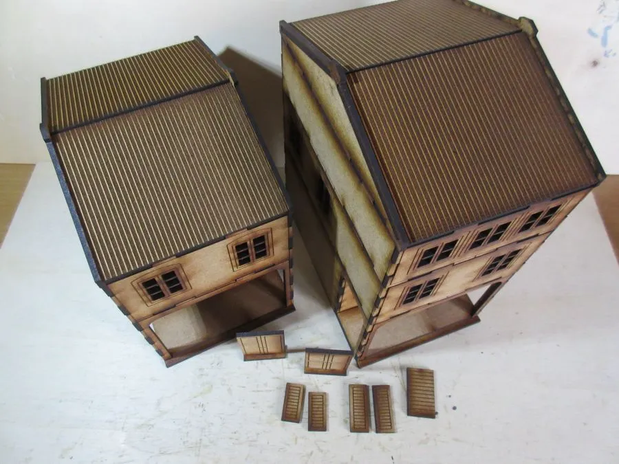 A set of 2 Asian Shop Houses at 28mm scale. The set consists of 2 ground floors (6cm high), 2 2nd floors (4 cm high), 1 3rd floor (3cm high) and 2 roofs (2.6cm high). There are also separate doors with stands and numerous shutters that can be glued on where needed. The foot print of each building is 8cm x12cm. Once glued together each floor slots easily onto the other floors enabling different heights of buildings to be made as required as well as enabling miniatures to be easily placed inside the buildings during use.