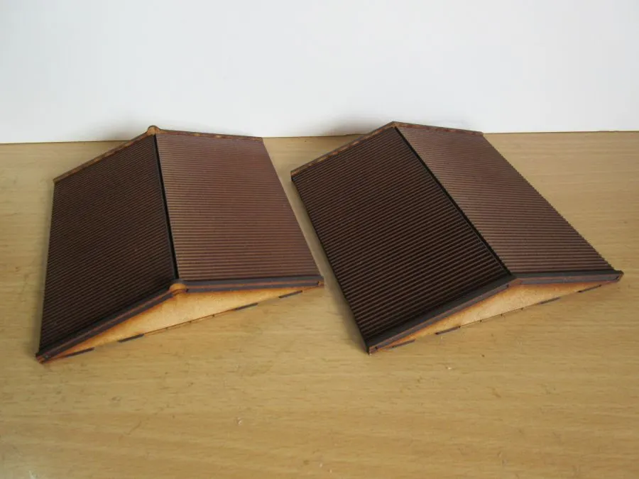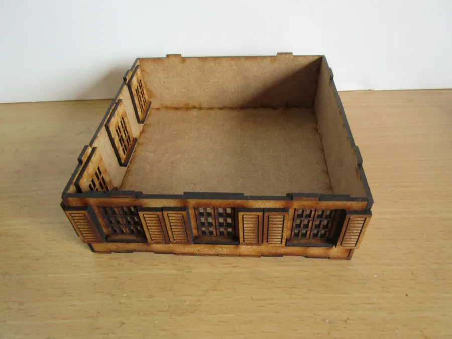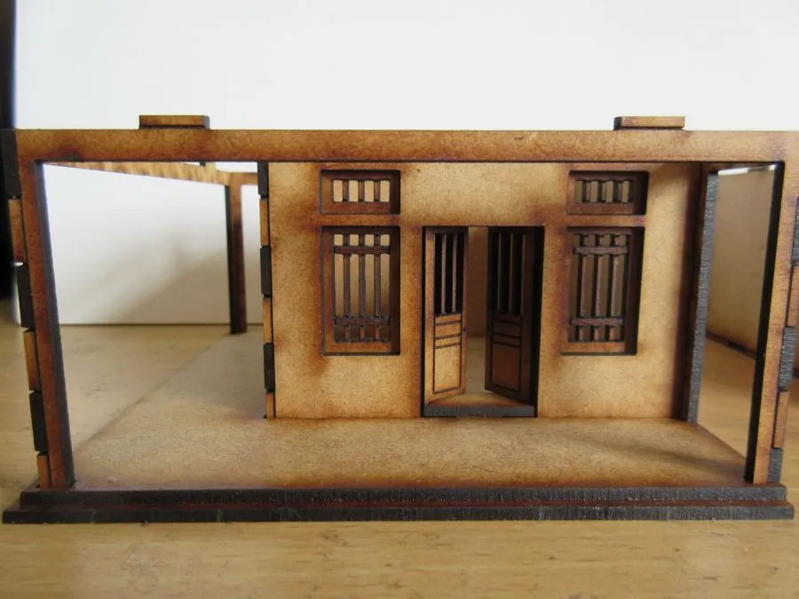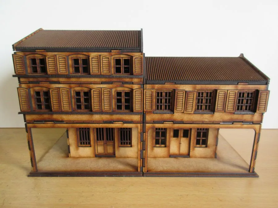 A set of 2 Corner Asian Shop Houses at 28mm scale. The set consists of 2 ground floors (6cm high), 3 upper floors (2 x 4 cm high and 1 x 3cm high) and 2 roofs (2.6cm high). The doors are hinged and there are shutters that can be glued on where needed. The foot print of each building is 12cm x12cm. Once glued together each floor slots easily onto the other floors enabling different heights of buildings to be made as required as well as enabling miniatures to be easily placed inside the buildings during use. The ground floors have 2 options for the placement of the door, 2 options for the air vents and 2 different doors that can be used. The uppers floors have 2 different types of windows that can be used and 3 different types of window sills. All these options allows for a great variety of buildings to be made.