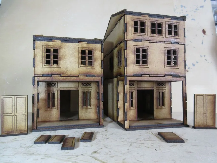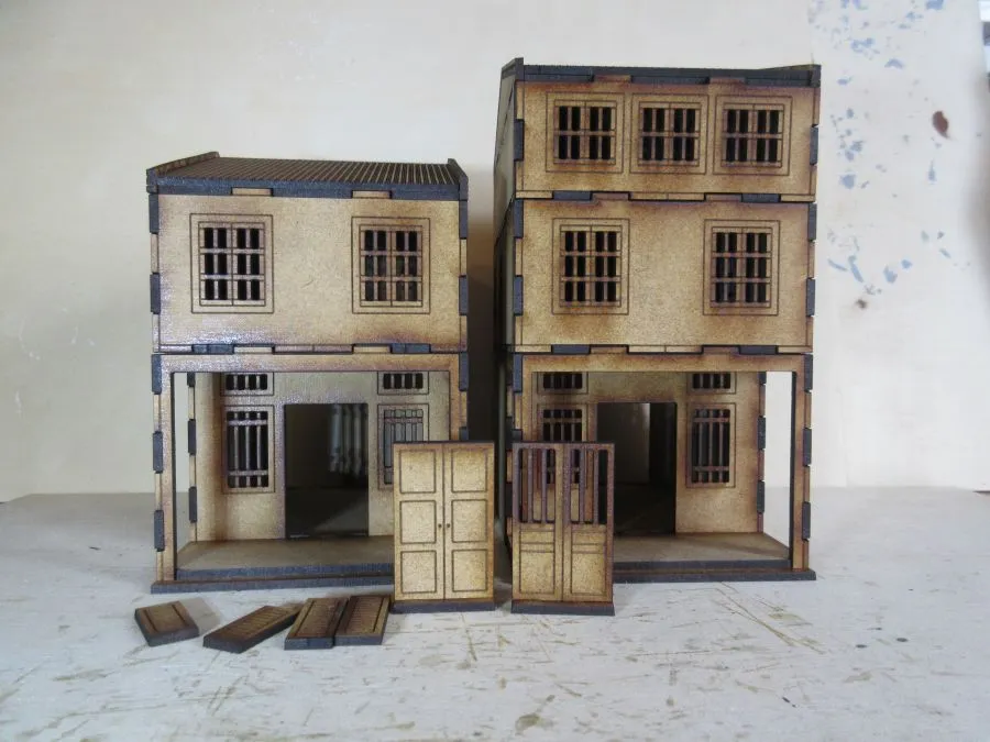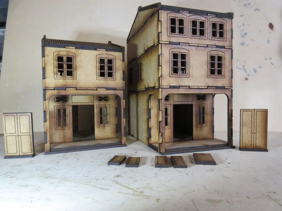 This is a multi-pack of our Asian Shop Houses containing the variant 1, variant 2 and variant 3 sets all at 28mm scale. Each of the three variant sets consists of 2 ground floors (6cm high), 2 2nd floors (4 cm high), 1 3rd floor (3cm high) and 2 roofs (2.6cm high). There are also separate doors with stands and numerous shutters that can be glued on where needed. The foot print of each building is 8cm x12cm. Once glued together each floor slots easily onto the other floors enabling different heights of buildings to be made as required as well as enabling miniatures to be easily placed inside the buildings during use.