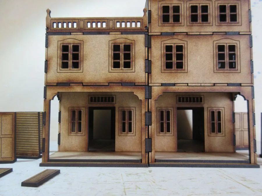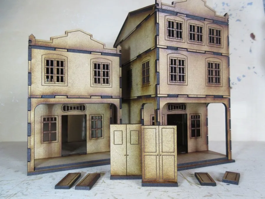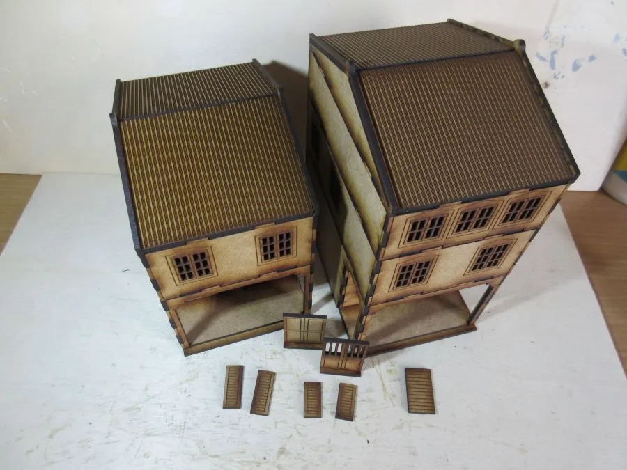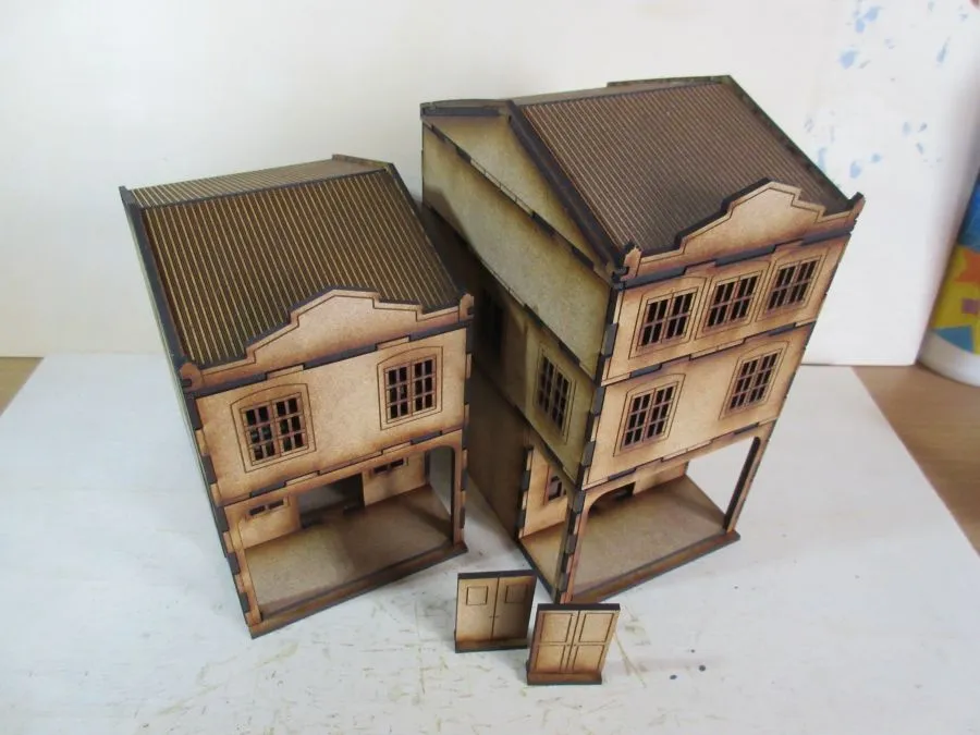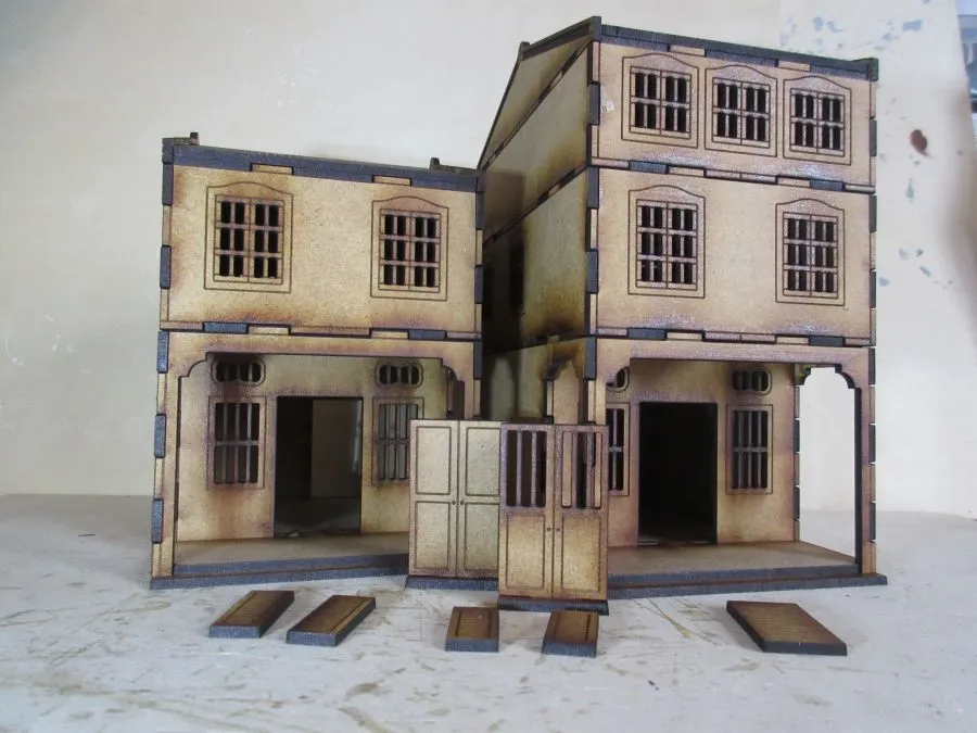 This is a multi-pack of our Asian Shop Houses containing the variant 4, variant 5 and variant 6 sets all at 28mm scale. Each of the three variant sets consists of 2 ground floors (6cm high), 2 2nd floors (4 cm high), 1 3rd floor (3cm high) and 2 roofs (2.6cm high). There are also separate doors with stands and numerous shutters that can be glued on where needed. The foot print of each building is 8cm x12cm. Once glued together each floor slots easily onto the other floors enabling different heights of buildings to be made as required as well as enabling miniatures to be easily placed inside the buildings during use.