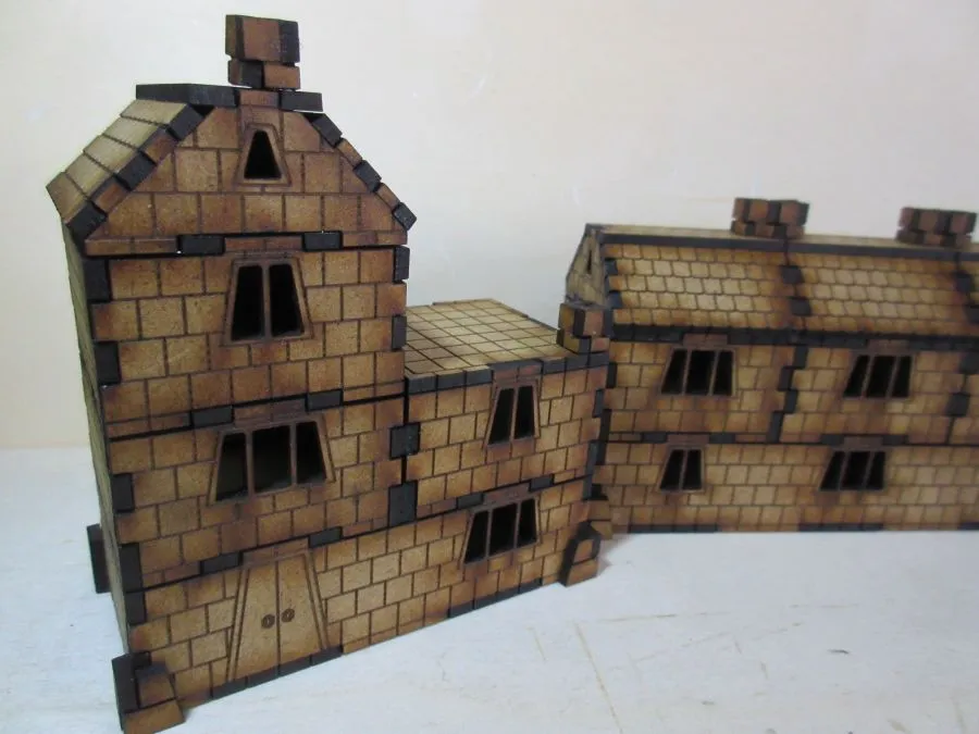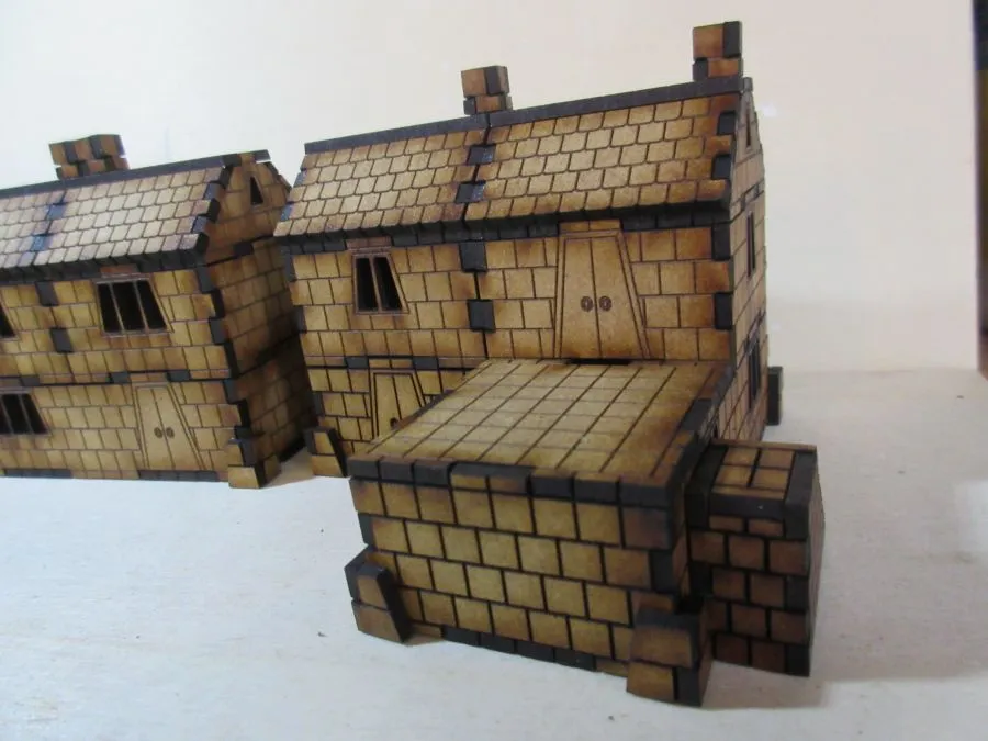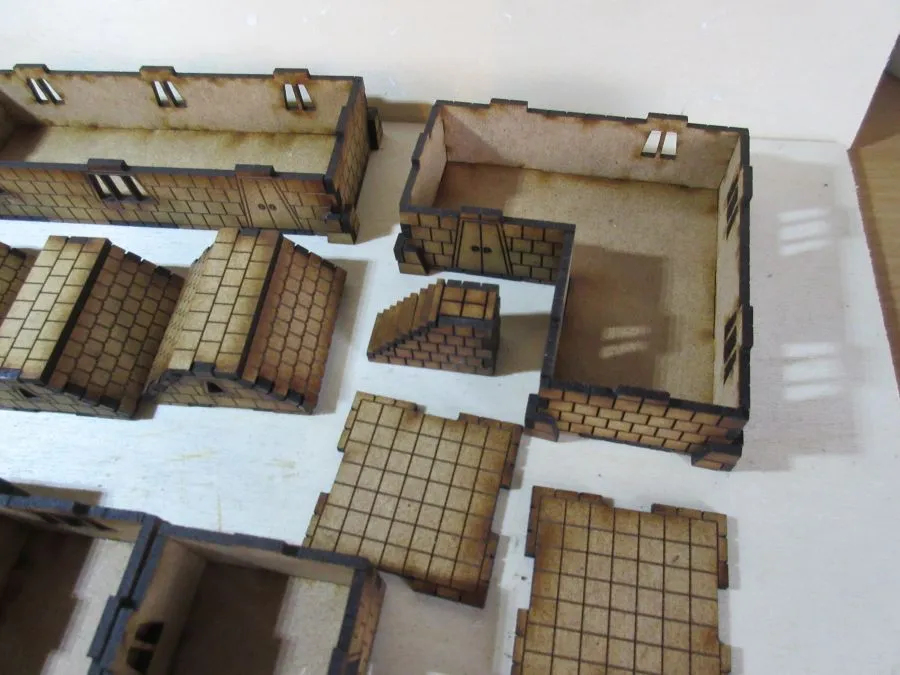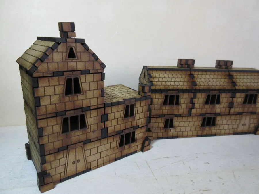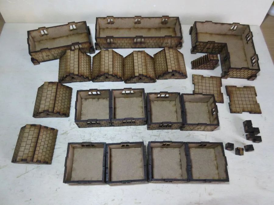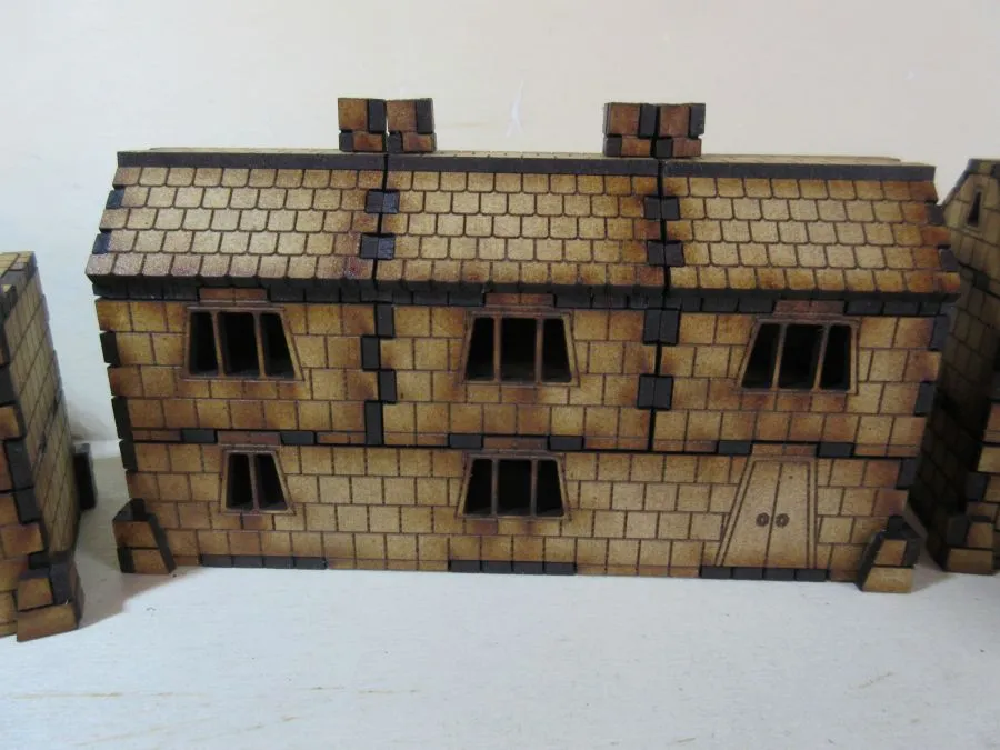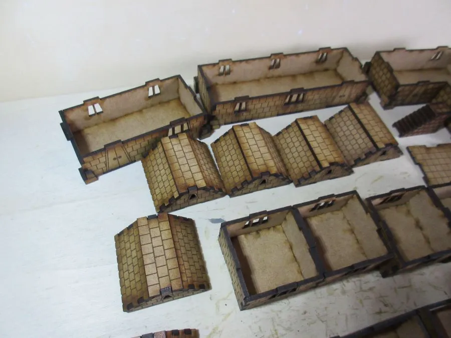 A set of 3 Dwarf dwellings at 15mm scale. The set consists of enough pieces to make 3 dwellings. There are 3 ground floor sections, one 45mm x 85mm, one 45mm x 125mm and one L-shaped approximately 85mm x 85mm, each 25mm high. There are 8 non-ground floor sections each 40mm square x 25mm, 2 flat roof sections 40mm x 40mm and 6 tiled roof sections each approximately 40mm x 40mm x 19mm. Also included are 8 chimney pieces and one set of outside stairs to the 2nd floor.