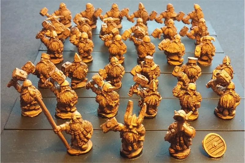 There are 30 variants of the Dwarian Hammermen figures. You will receive a random mix of 32 Hammermen, and a random set of Command Figures consisting of an Officer, Standard Bearer and Musician, plus 35 Shields.