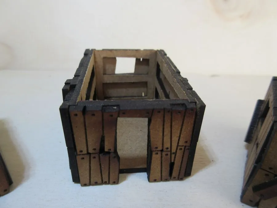 A set of 3 Orc shacks at 15mm scale. The buildings are each approximately 65mm long, 45mm wide and 33mm high. Each roof is designed to be easily removable as long as it has not been glued on. A variety of extra planks are included that can be glued on the outsides to add extra variety.